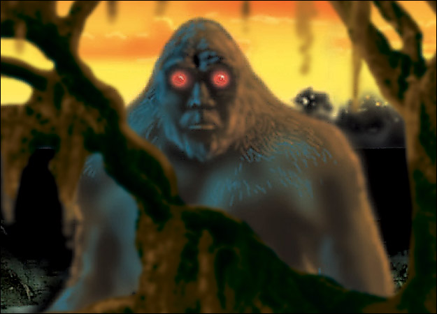 The incident inspired a 1973 film called The Legend of Boggy Creek, which in turn inspired additional sightings up through the late 1990's. The Southern Sasquatch is described as a giant, human-like ape creature with long arms, long, dark hair, three toes on each foot and bright red eyes the size of silver dollars. It's said to walk with a shuffling gait and run in a hunched or slouched posture while swinging its arms, like a primate. Original reports from the 1970's describe the creature as 7 feet tall, up to 300 pounds and a chest about 3 feet wide.